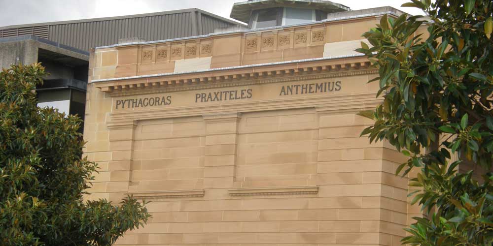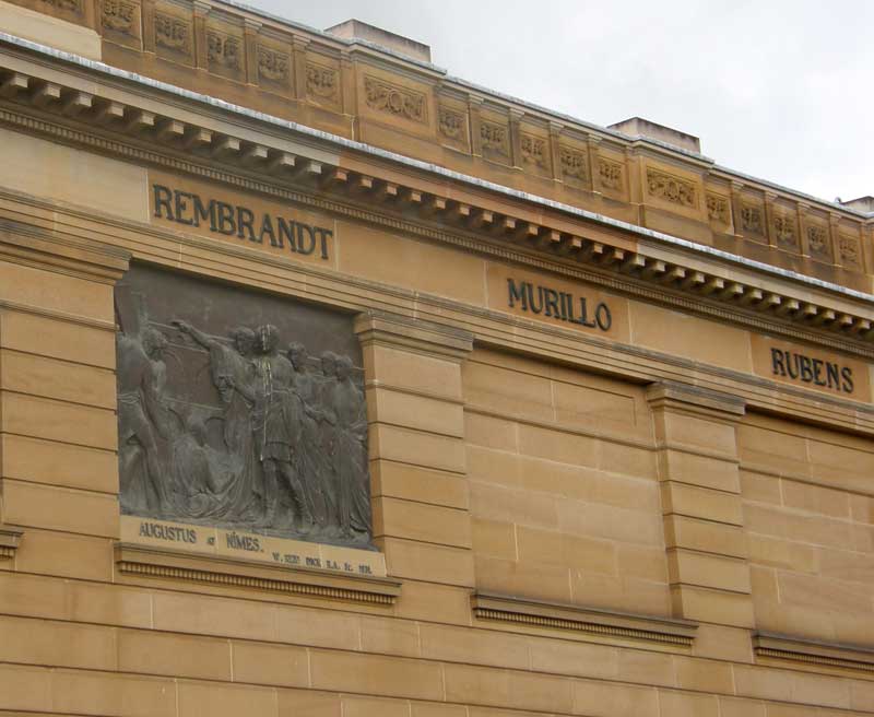 At the request of the Trustees of the Art Gallery, Vernon included twelve panels below the artists' names which the Trustees intended to use to depict the various eras of art. The first to be erected were to be a series of six panels depicting the six 'distinctive historical art periods' of the Assyrian, Egyptian, Grecian, Roman, Gothic and Renaissance. Presumably the remaining six would be filled later and have a similar theme. Bronze was chosen as the medium, as it was decided that marble ??]caught too sharply the glare of sunlight. The Trustees organised a competition for the first two panels which were to depict subjects typical of Assyrian and Egyptian Art. The general treatment of the designs should harmonize with a panel already fixed, Phyrne before Praxiteles by the English sculptor Percival Ball, and with the architecture of the building. Only four of the twelve panels were ever filled. They are set high on the south half of the front elevation, and beside them are the two empty panels intended to depict Gothic and Renaissance.
