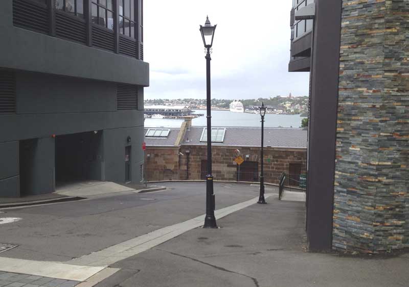 The gas main of about 12" (30cm) diameter supplied gas to Sydney street lights during the initial operating phase (in 1841) of the Australian Gas Light Company (AGL Co) gas works at Kent Street. The shortage of cast steel pipe caused AGL to have local contractors fabricate the wooden pipes. The pipes would have been reasonably gas tight as they were painted with tar and then further coated carefully with tar impregnated calico. Jenkins Street came into being as a boundary road between properties created by the subdivision of surrounding land in 1842. The name honours ex-convict James Jenkins, who owned the land prior to subdivision. It was for many years a private laneway across the end of Gas Lane which led to the gasworks there. Parts of a sandstone office and store at the end of Gas Lane are all that now remain of a large gas works which used to exist here.