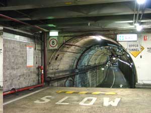 Wynyard Station tram tunnel, which led onto the Sydney Harbour Bridge and what is now the walking lane on the bridge's east side. It is now part of a nearby hotel's underground car park. The entrance tunnels to Wynyard station (below) are visible beside the pathway.