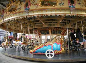 A major attraction at White City amusement park was its giant carousel specially ordered from the Philadelphia Toboggan Company (PTC) in Pennsylvania, USA by Cozens Spencer. In 1913 it cost him US$14,657.00 plus shipping. Like a giant puzzle, the huge carousel, serial number PTC 30, complete with cast iron machinery and hundreds of timber parts, set sail from America in October, 1913 and arrived in Sydney in November. The carousel was one of PTC's "high class" rides, a grand machine designed for a permanent location. With a platform 52 feet in diameter, the War and Peace-themed carousel features 68 individually carved horses, two Roman chariots, elaborate decoration and 36 cherubs frozen in flight on the rounding boards. Carved from basswood and adorned with gold and silver leaf, the horses and chariots were the work of master craftsmen, many of whom had immigrated to America from Europe and Russia in the late 19th century. 26 original scenery paintings adorn the centre panels and rounding boards, painted by PTC's Max Soltmann. The "War and Peace" theme is reflected in the romantic flowers and butterflies painted on some horses contrasted by swords and shields carved on others. PTC No.30 was the only PTC carousel to be exported.