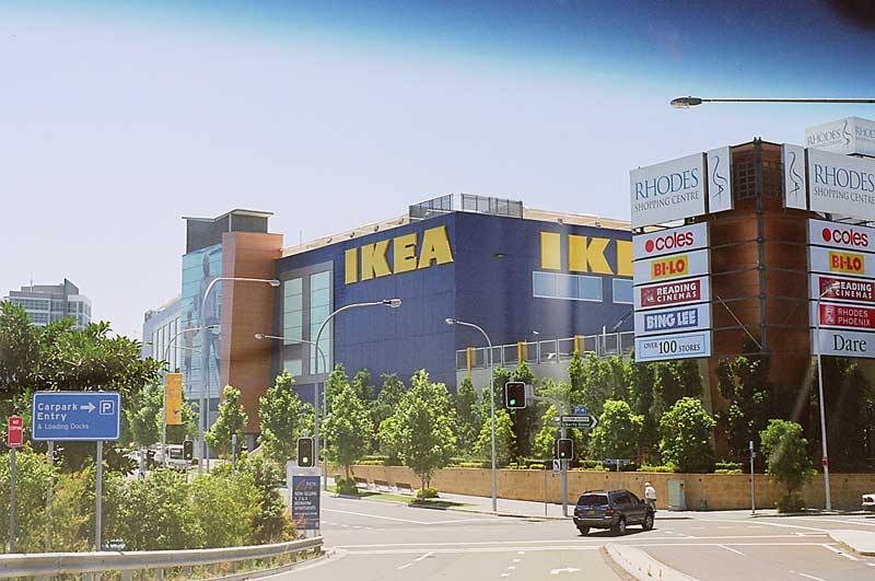 The western section, west of the railway line, features new developments on the former chemical and industrial sites, and includes: the Rhodes Waterside Shopping Centre; many new (2007) apartment blocks; and a public foreshore walkway with two small parks (one incomplete Jan 2010).
