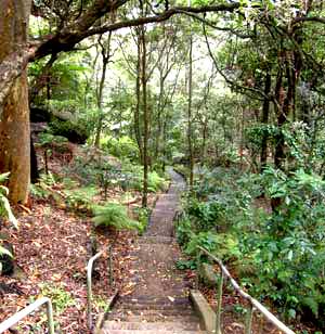 It is perhaps a blessing that Parsley Bay is overshadowed by its more famous neighbour, Watsons Bay, as this picturesque corner of Sydney Harbour is a quiet haven for those lucky enough to know of its existence and have discovered its tranquility. Though the least frequented, it is as attractive as any other bay on the South Head peninsula, and the perfect place for children to take a dip in its sheltered waters or fossick for shells and crabs on the rocks while the adults laze away the afternoon in the shade of the Moreton Bay fig trees.Circling Parsley Bay is a rocky ridge which forms a small valley through which a small stream flows. The stream enters the valley high on the escarpment at the valley's head and cascades over rocks for some metres before winding its way through the only remaining natural strand of rainforest on Sydney Harbour's southern shores, to empty into the harbour.