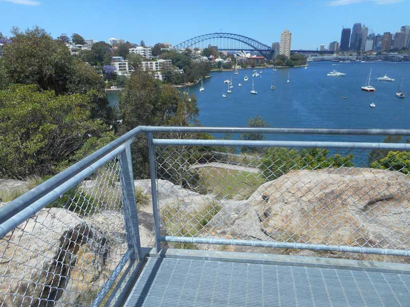 Groups of smaller engravings, 6 shell middens, 2 rock shelters, a waterhole and axe grinding grooves are located near the waterline towards the eastern and western tips of Balls Head. Alongside the lookout at the eastern end of the car park is a rockpool used to collect drinking water with axe grinding grooves beside it. The lookout offers panoramic views up and down the harbour, taking in the opera House and Harbour Bridge, city skyline, Darling Harbour, Goat Island, the Balmain peninsula and the Parramatta River up to the Gladesville Bridge.