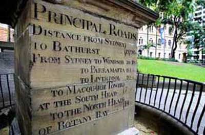 Lachlan Macquarie arrived in Sydney from England on 28th December 1809 with his wife Elizabeth, replacing Captain William Bligh who had been relieved of his duties as Governor-in-Chief of NSW in the Rum Rebellion on 26th January, 1808. A Scotsman of youthful energy and competence and a carpenter by trade, Macquarie was New South Wales longest serving Governor and made more impact on the colony than any other. From the day he stepped ashore he treated Sydney not just as a penal colony but as a settled farming community and channelled all his energies into its growth and development. His predecessors had all been naval men who, apart from Phillip, viewed the settlement as nothing more than a naval base with convicts as the non-enlisted labour force, but such was not the case. Free settlers, most of whom were convicts who had long since completed their sentences, far outnumbered the convicts, but they had continued to be treated as prisoners and second class citizens after their emancipation. They were a people struggling for survival with no hope, no civic pride and no future. Macquarie was determined to change all that. He had considerable experience of colonial life in America and India and firmly believed the success of the young colony depended on its commercial prosperity. Macquarie was appalled at the state of shameful dilapidation of Sydney. He immediately set about restoring order, beginning with the introduction of systematic naming of streets, dropping the use of terms like row and alley. Sgt. Majors Row - it was also known as Tank Stream Row and High Street - became George Street, Governors Row became Bridge Street, Stream Row became Pitt Street. Macquarie closed off many little-used thoroughfares, and widened others (he doubled the width of Pitt Street) discouraging the common practice of cutting through the bush rather than using the road to go from one place to another. Typical of Macquarie's attempts to bring order to the town was his ruling that any stock found wandering in Hyde Park would be confiscated. Another was the erection of an obelisk in Macquarie Place from which all distances within the colony of New South Wales were to be measured. Distances from Sydney to towns and cities all over Australia are still measured from the obelisk today.