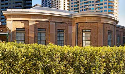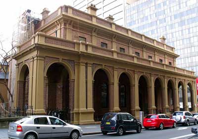 Originally known as the Rum Hospital because its builders were allowed to export rum for resale, the Sydney Hospital once occupied a number of buildings on this sight. The northern wing is now Parliament House, the Southern wing is occupied by the Sydney Mint Museum. By the 1870s, the central section, which had been erected on poor foundations, was in danger of collapse and had to be demolished. It was replaced by new buildings which continue to function as a hospital today. These newer buildings are of Classic Revival style and the one which fronts onto Macquarie Street boast floral stained-glass windows and a Baroque staircase in the entrance hall. These fine specimens of Victorian architecture were created out of Pyrmont sandstone and feature arcaded verandahs with ornate balustrading. One of two domed former gatehouses has functioned as a tiny corner store.