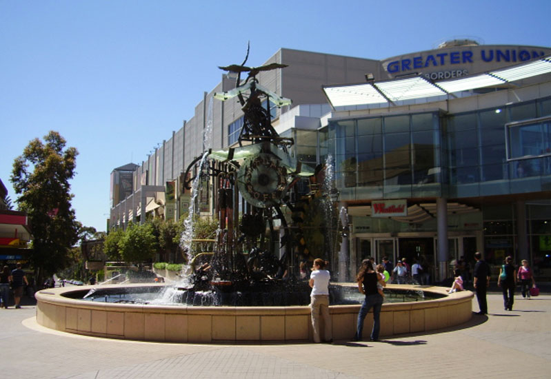 The Hornsby Water Clock, titled Man, Time and the Environment is a piece of kinetic sculpture, a decorative fountain and a functional clock in the Florence Street pedestrian mall in Hornsby, New South Wales, Australia. Unveiled in 1993, the sculpture was designed and engineered by Victor Cusack and constructed of bronze, stainless steel and glass by Victor and his foundry floor manager Rex Feakes. It is a combination of three water-powered clocks a 4th-century BC Greek clepsydra, an 11th-century Chinese water wheel clock and a 17th-century Swiss pendulum clock plus a 17-note bronze carillon to ring the hour based on a 250-year-old design found in an old English church. The whole assembly is mounted on a floating pontoon that rotates every 12 hours giving a fourth time indicator as a pointer sweeps past Roman numerals placed in the water around the fountain s perimeter.