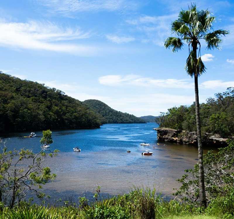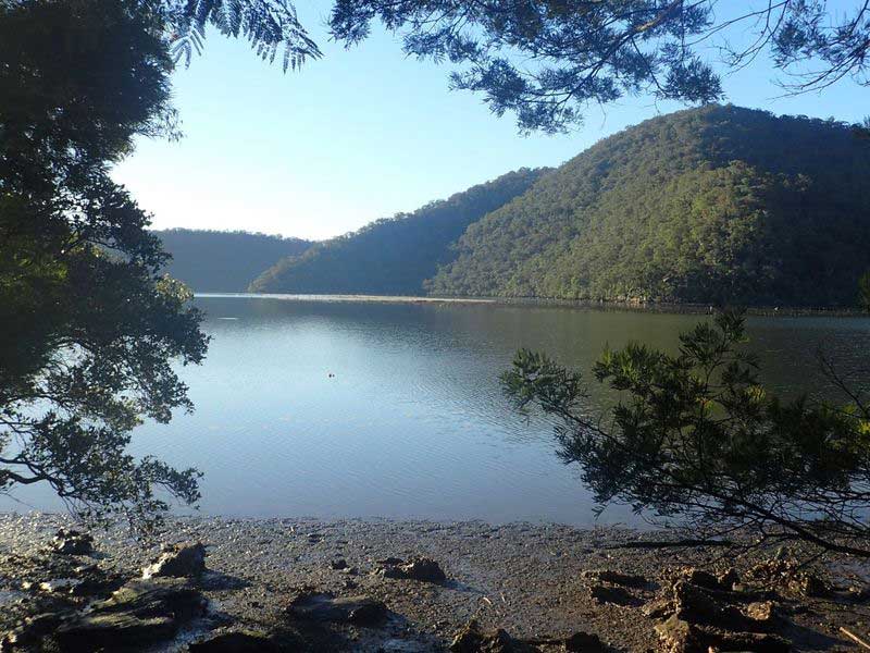 Another excellent station-to-station bushwalk is the Jerusalem Bay track. This 13.4 km one-way trail begins at Cowan station and heads east to Jersusalem Bay on Cowan Creek, before heading north to Hawkesbury River station at Brooklyn. It is an all-day walk, taking around 6 hours, the scenery ranges from foreshore to ridge top lookouts and includes the circumnavigation of Brooklyn Dam. Jerusalem Bay is popular with bushwalkers as it is part of the Great North Walk. The bay is sometimes known for an iconic photo of the single palm in front of the water. The bay itself is also popular with boaters who can anchor in the bay.