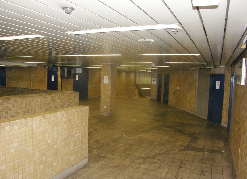 In 1976 new work for the line was commissioned that required the integration of the Eastern Suburbs Line with the existing Illawarra Line, construction of a second track from Central to Erskineville, underground platforms at Redfern Station and a turnback tunnel (for trains coming from the Illawarra Line) at Martin Place. As with Central station, it was proposed that four new platforms would be built at Redfern, two for the Eastern Suburbs Line and two for the future Southern Suburbs Railway to Maroubra. Two below-ground platforms were completed and are now Platforms 11 and 12. The two platforms for the Southern Suburbs line above Platforms 11 and 12 were only partly constructed. The entry area to the platforms was completed (below) but does not lead anywhere.