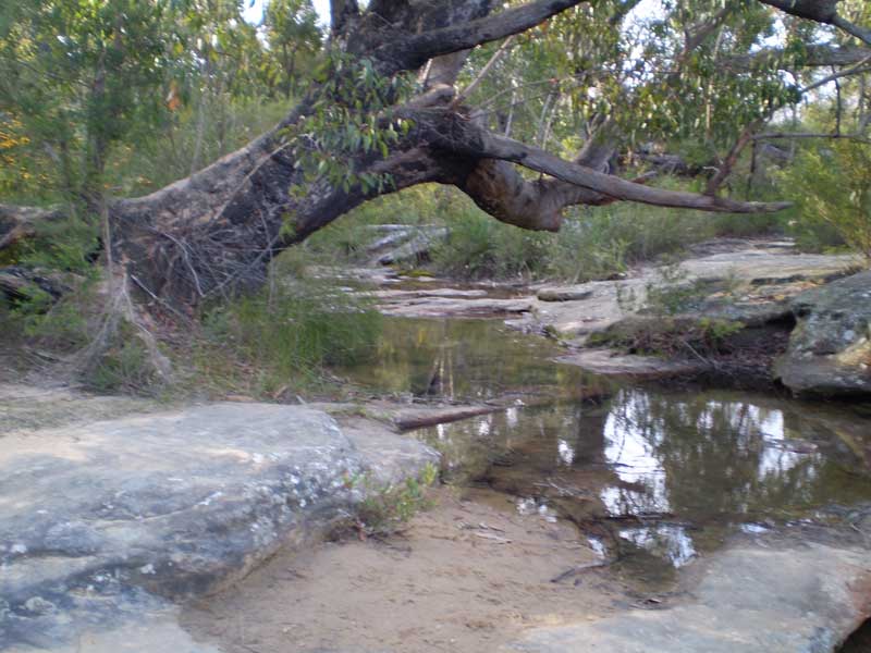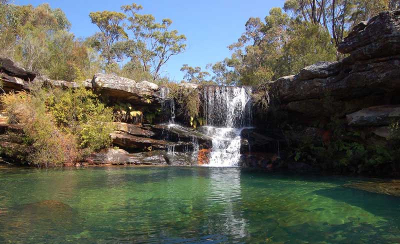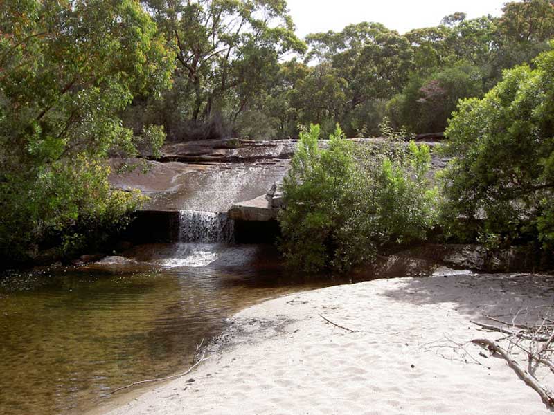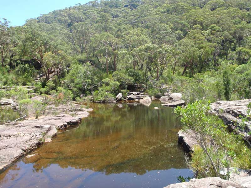 Now that the Royal National Park railway branchline is used only by trams from the Loftus Tramway Museum, the only direct access to the Park by rail is from Heathcote or Waterfall stations. They are joined by a track which wanders through the western section of the park. Take the fire trail at the east end of the oval on The McKell Ave to the south of Waterfall station. Known as the Uloola Track, it leads past Callaghans Tor and Uloola Swamp to Uloola Falls. On the north side of the Uloola Brook above the falls, take the the Karloo Track to Uloola Pools and Karloo Pool, a large swimming hole on Kangaroo Creek. Continue on to Heathcote station for the return train trip to Sydney. Allow 4 to 6 hours. Moderate walk.