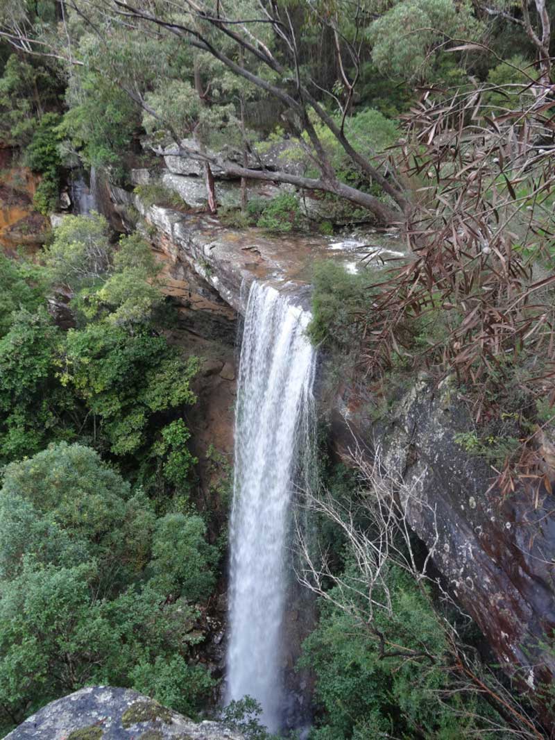 National Falls: A two-tiered waterfall in which the upper falls drops some 6 metres onto a rocky platform before plunging deep into the valley below via the second falls. A novel feature is the ability to walk into the overhang over which the upper falls cascades (above), allowing access behind the water as it falls. Located beside The McKell Drive not far from the park entry point from Waterfall, it is these falls which gave the locality of Waterfall its name.