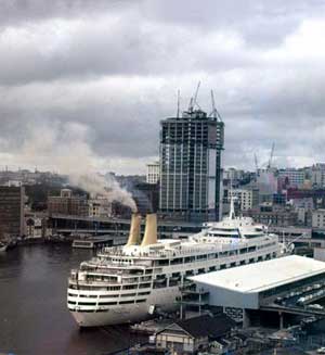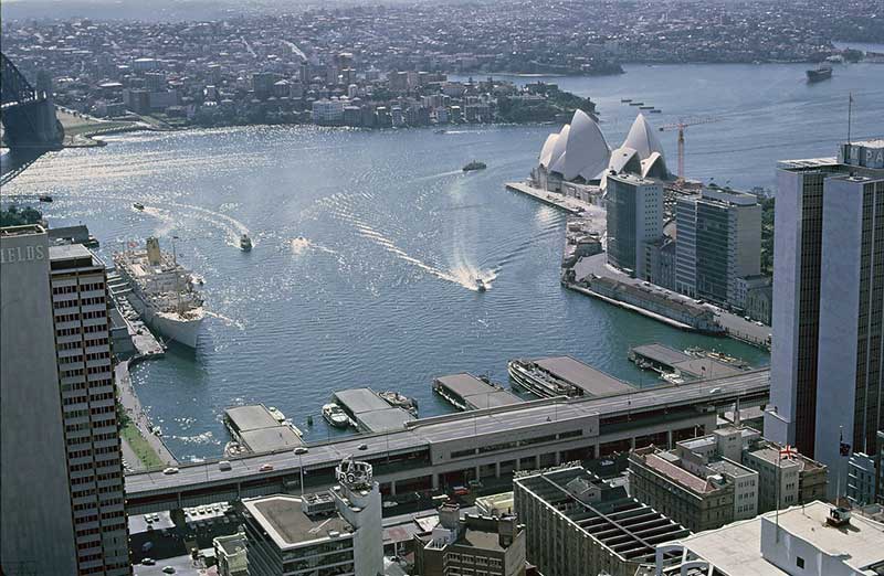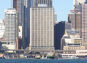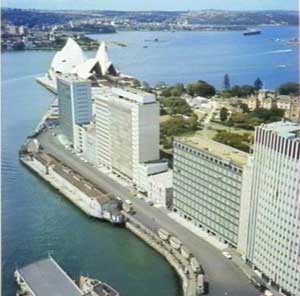 The old and the new - the 1976 AMP head office building towers over the 1962 AMP building on Sydney Cove (left forefront)