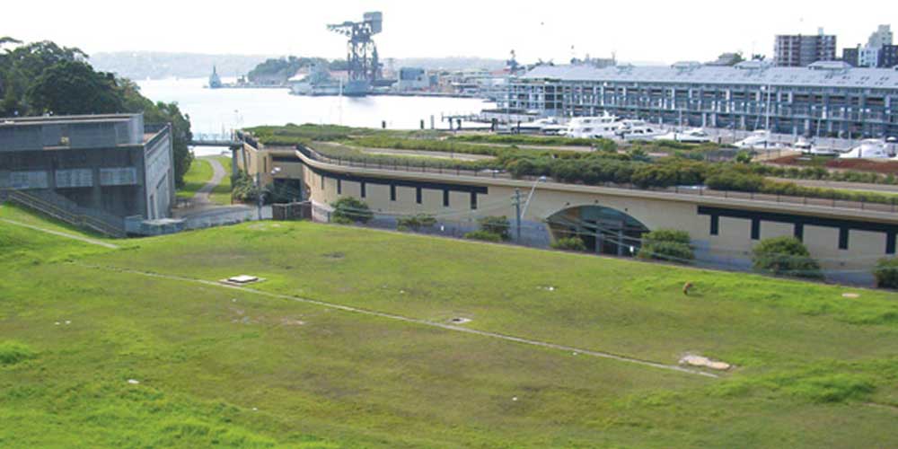 Sited below part of The Domain, between a substation and the start of the Eastern Distributor Tunnel in Woolloomooloo is a rectangular park elevated above Lincoln Crescent. The grassed area of the park, behind which are the Botanical Gardens, The Domain and The Art Gallery of NSW, covers the roof of two x 280,000 litre capacity oil reservoirs. Now empty, they were once used for oil storage by the Royal Australian Navy, whose Garden Island base is situated nearby on the other side of Woolloomooloo Bay.