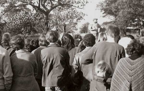 A number of significant political rallies and meetings have occurred in at Speakers Corner, including Palm Sunday rallies, May Day demonstrations, and anti-war and anti-conscription protests. During the Australian constitutional crisis of 1975, the Australian Labor Party held their policy launch in The Domain on 24 November 1975 before a huge crowd.