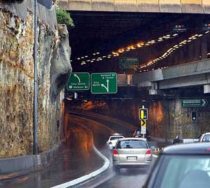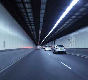 The four lane tunnel has a traffic capacity of 2,000 vehicles per hour. Traffic is monitored by loop detectors every 120 metres and employs more than 30 closed circuit cameras. It is lit by 8,000 fluorescent tubes. Ventilation is by 14 supply and 16 exhaust fans, each one reversible and up to 2.5 metres in diameter. The 2.3 km Tunnel has cut crossing time by 10 minutes in peak hour and is said to save 13 million litres of fuel a year by reducing bridge traffic by up to 60,000 vehicles per day. With two lanes north and two south, running parallel in separate sections, it has a design life of 100 years.