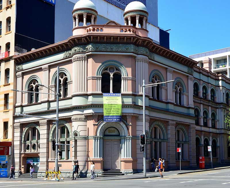 Bank of New South Wales, 824-26 George Street, Broadway (1894): Custom built for the Bank of New South Wales, this well proportioned and skilfully detailed Federation Romanesque style building was designed by Varney Parkes, a prominent and skilled architect and son of the Premier, Sir Henry Parkes. The building. Featuring rendered brickwork, sandstone, timber framed windows and glass and brass entry rendered brickwork, was built at a cost of 17,400 pounds. It was associated with a gold refinery and smelter making the bank important in the gold bullion trade. A trough from gold smeltering activities remains extant in the basement. The building demonstrates an unusual use of the Federation Romanesque style in a city commercial building, creating a refined image for, what was at the time, the major Bank in Australia.