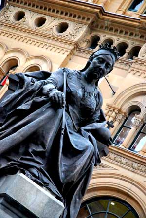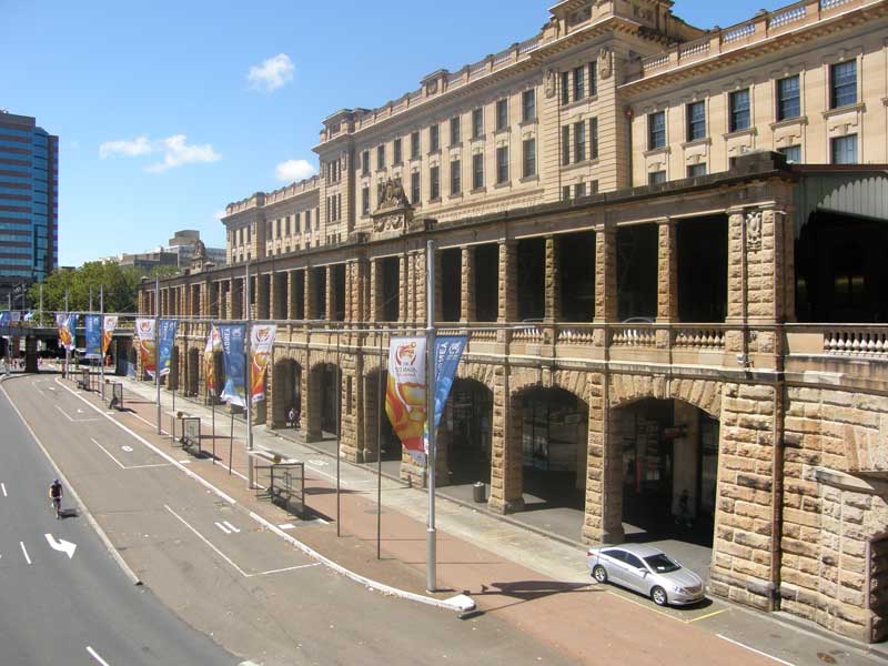 Queen Victoria Building, George Street, Sydney (1898): Designed by City Architect George McRae in 1898, this spacious and ornate building of Romanesque design was for two decades a produce market. Built of Pyrmont sandstone, it enjoyed many decades of service as a produce market until it fell into disrepair. After surviving numerous threats of demolition and various uses including that of the City Library, it was refurbished at a cost of $75 million and reopened in its present form in 1986.