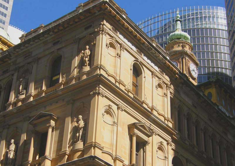 Its facade features 48 niches, 23 of which are filled with statues of prominent figures in Australia's early history including explorers Hume & Hovell, Sir Thomas Mitchell, Blaxland, Lawson & Wentworth, George Bass, Matthew Flinders and Sir Joseph Banks, the botanist who accompanied Captain James Cook on his journey of discovery in 1770. 25 niches remain unfilled. The central copper dome of the building, often called The Onion because of its shape, was designed to take a telescope though one was never installed. The domed roof can be revolved to aid celestial tracking. The telescope guide and window for the telescope lens can be seen when the building is viewed from cnr of Bridge and Young Streets.