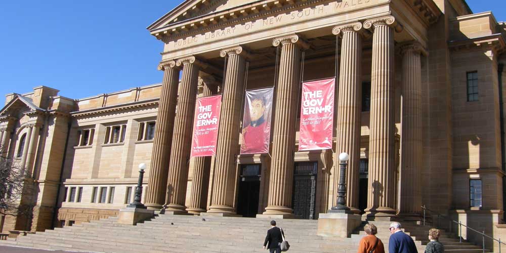 Mitchell Library, Shakespeare Place, Sydney (1905-10): The Mitchell Library Wing of the State Library of NSW is the first in a row of buildings which form the majestic streetscape of modern day Macquarie Street. An impressive sandstone building, its striking Ionic columns support the huge vaulted ceiling of the vestibule and look down upon a giant mosaic replica of an old map documenting the voyage of Dutch seaman Abel Tasman in the 1640s which forms the vestibule floor. Only the decrorative aspects of the building's exterior were made of Pyrmont sandstone. The rest of the buiilding was built with Maroubra sandstone and trachyte external walls, and plaster finished brick internal walls. The library's Dixson Wing (completed 1939) was completed in 1939-42 and Public Library entrance and northern office (completed 1942) also used Maroubra sandstone.