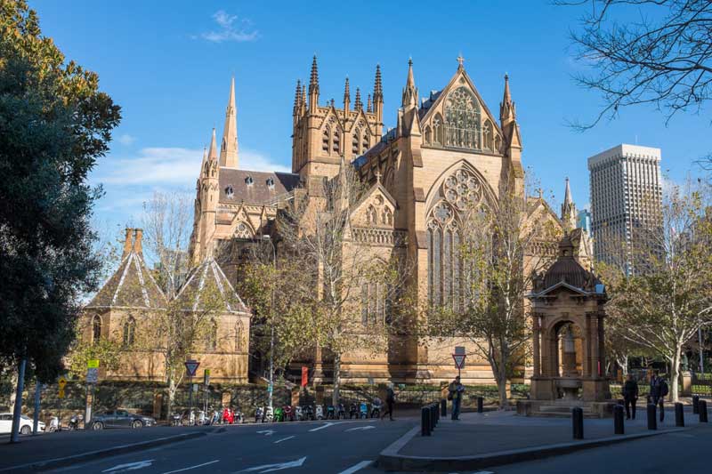 St Mary's Cathedral, Cathedral Street, Sydney (1882): In 1821, Governor Macquarie laid the foundation stone to St Mary's Chapel in Cathedral Street, Sydney, on the site of the first land grant to the Catholic Church in Australia. The original St Marys was built many years later but burnt down in June 1865. It's replacement, which remained unfinished for a further 119 years, is the work of architect William Wardell. His Gothic Revival style cathedral was built and opened in stages, the first in 1882. In 1913, Australia's first Cardinal and Archbishop Kelly laid the foundation stone for the final stage, which was completed in 1928. The Celtic-inspired terrazzo mosaic floor of the crypt took 15 years to complete from 1946 to 1961. The twin southern spires proposed by Wardell were included as part of the final stage but were never erected for financial reasons. The towers stood minus their spires for the best part of a century until a fundraising drive paid for their construction in 2000 along with the purchase of a new organ and renovations to the cathedral's stonework. To comply with modern Earthquake bracing requirements, the spires have steel frames which were placed by helicopter and then used as cranes to lift the stone cladding.