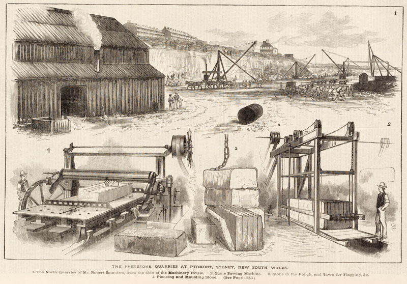 The streets and tracks of the peninsula at Pyrmont became rutted as the bullock and Clydesdale teams carried sandstone blocks to such famous building sites as Sydney University, the Colonial Secretary's Office, the Department of Lands, the Australian Mutual Provident Society and the Australian Joint Stock Bank.