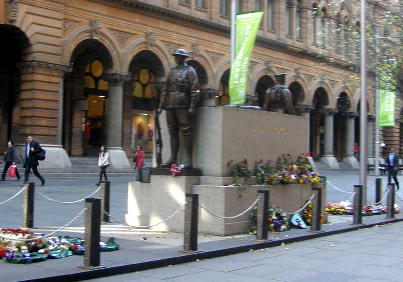 (1929); The Art Deco Cenotaph is the site of Sydney's annual Anzac Day war remembrance service. The bronze statues of a soldier and sailor, which are mounted on a granite base, are the work of sculptor Bertram MacKennal. The design of this 'altar of remembrance', as Mackennal described it, is unusual in its simplicity - a rectangular block of granite, flanked by realistic, slightly larger than life sized figures depicting a soldier and a sailor, standing guard.