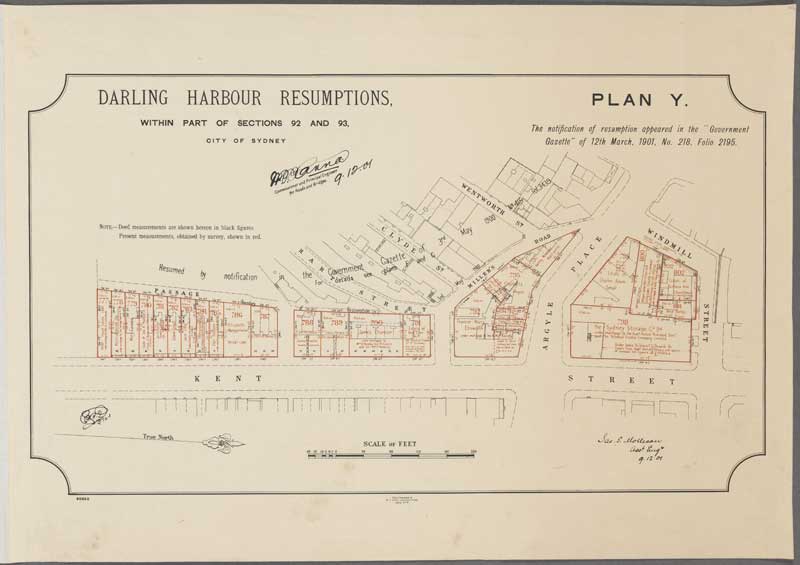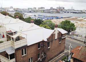 The first reported death from the bubonic plague was Arthur Payne of Ferry Lane - a small, narrow thoroughfare leading down the the wharves of what is now Walsh Bay on 25th January 1900. Like hundreds around him, Payne lived in squalid conditions in The Rocks where the dreaded disease quickly spread among residents and waterside workers. The Darling Harbour area was quarantined and residents forbidden to move out of the area. Many opted to be quarantined at North Head. As many residents worked outside the quarantined area, they were paid six shillings a week as survival money while the crisis lasted. The plague became the excuse to reclaim large areas of real estate around the wharves. Medical opinion at the time urged the government to take over the areas that were deemed most unhygienic and place them under the authority of the Darling Harbour Resumption Advisory Board, chaired by Robert Hickson. Work was begun in March 1900 to repair houses or, in the worst cases, have them demolished. Architect and engineer George McCredie was put in charge of this operation. Work on the wharves ceased while homes were cleaned, whitewashed, disinfected or demolished.