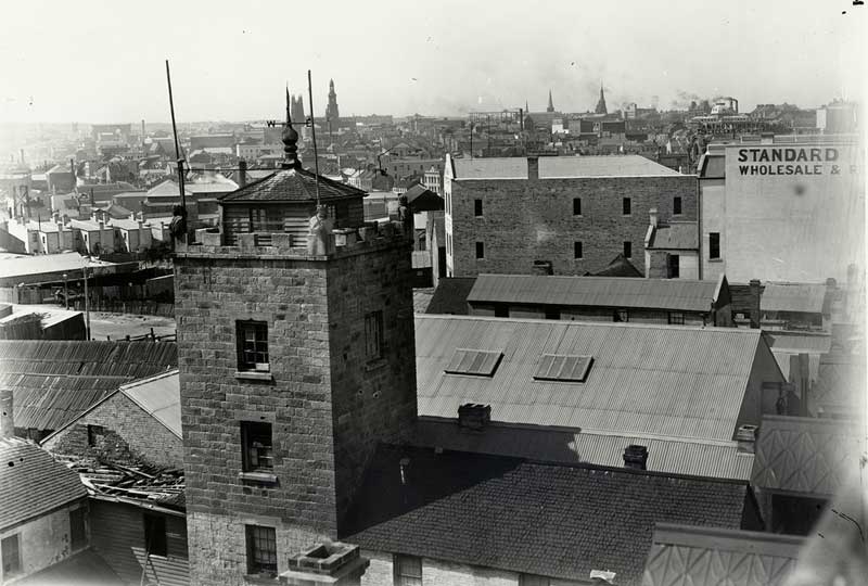 Sydney once had a shot tower on George Street, that had an observation platform at the top. It was built by a man named Hancock in 1840, and was familiarly called Hancock s Tower . Many romantic legends circulated around Sydney town as to the purpose of the tower, the most common being that the builder put it up as a prison for his wife. But the fact is that Hancock was a shrewd, hard-working wheelwright, who had his smithy at the intersection of George and Market Streets.