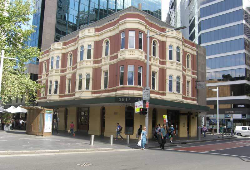 The Ship Inn was erected in 1905 directly over the mouth of The Tank Stream on what used to be mudflats. The hotel was built on Blackbutt piles driven into the mud to a depth of 30 metres. The building is also believed to have been built over the hulk of the schooner, Governor Bligh, which was built on the Hawkesbury River.