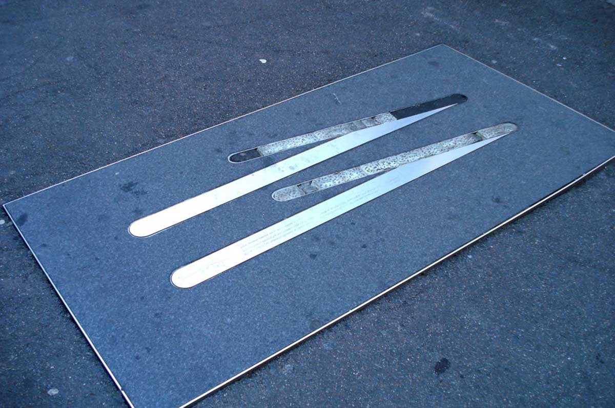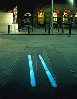 Tankstream - into the head of the cove ... , a series of street markers, celebrates The Tank Stream, its importance in the founding of the city and its continued survival under the city streets. The artwork marks the course of the Tank Stream with five key sites through the city from Pitt Street Mall to Alfred Street. Coloured glass modules lit from within evoke the existing subterranean stream flowing beneath the city streets. Created by Lynne Roberts-Goodwin.