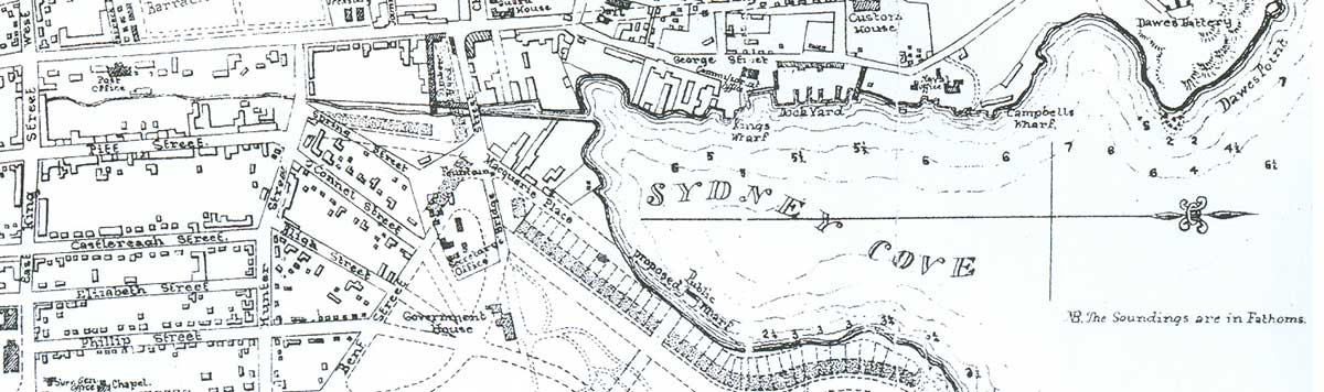 Location: Pitt Street, SydneyOne of the major influencing factors in Gov. Arthur Phillip's choice of Sydney Cove above other bays in Port Jackson for the site of the settlement of the Colony of New South Wales in 1788 was a little ferny creek. It flowed north from swampy high ground located within the area bounded by Market, Park, Elizabeth and Pitt Streets through a small, closed valley and into the cove through a tidal estuary. It was fed and filtered from the seepages of mosses and undergrowth that provided the spongy cover of its porous sandstone base. Sydney Red Gums (Myrtles), Banksias, Acacias (Wattles), Cabbage Tree Palms and Tree Ferns shaded an undergrowth which Jof orchids, ferns, plants and flowering shrubs which thrived in the shaded environment of rotting leaves, bark and boughs of fallen trees. The nature reserve of Parsley Bay at Vaucluse, some six kilometres west of Sydney Cove, with its riverlut, small closed valley and rainforest vegetation, gives an inkling as to what Sydney Cove of 1788 must have been like, being today much as it was when Captain Philip first found it. A wander through this reserve is like a walk back in time.