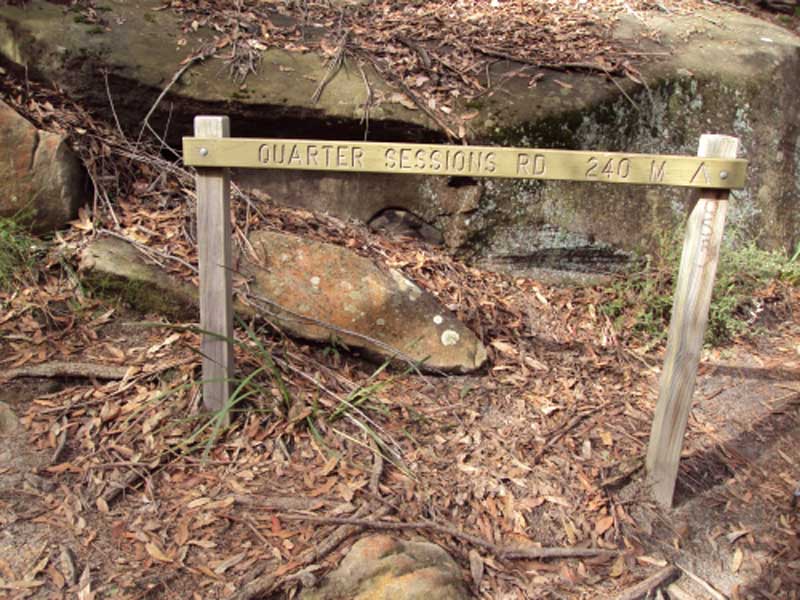 Over 100 Aboriginal sites have been recorded in the Hornsby region. These include engravings on sandstone ridges; rock shelters on the valley slopes containing cave paintings or drawing sites and archaeological deposits; open campsites and grinding grooves on valley floors; shell middens along tidal waterways; and scarred trees. A set of engravings are to be found on the Great North Walk bush track near the end of Quarter Sessions Road )photo above). Mainly fish and kangaroos, they are located off the main track on a rock face close to the corner of a backyard. Another group, on a large slab of rock, was removed from a nearby housing development site to its present location to save it from destruction. It has an observation ramp leading up to it from Quarter Sessions Road.