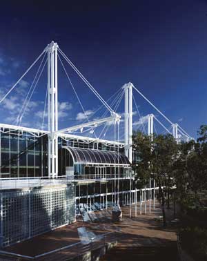 Phillip Cox designed the Exhibition Centre in the modernist style with multi-tiered glass surfaces over five interconnected halls with tall steel masts rising overhead in a maritime theme. The project took 36 months to complete and was built by the Darling Harbour Authority for the state government of the time. The building has been awarded several acclaims including the highly coveted Royal Australian Institute of Architects Sir John Sulman Medal in 1989 and MBA Excellence in Construction Award in 2007. It was met at one end with the John Andrews designed Sydney Convention Centre, semi-circular in appearance and quite an impressive building in its own right. Both served as venues for events during the Sydney 2000 Olympics, both were regarded as quintessentially Sydney buildings.